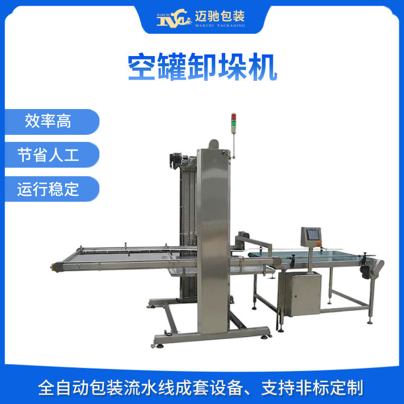 將一層一層的空罐送到理罐機上,應用于馬口鐵罐及鋁罐的卸空罐作業整機主體框架不銹鋼結構,部分傳動軸碳鋼電鍍伺服馬達和減速機驅動取罐裝置升降PLC控制、觸摸屏人機界面顯示,操作簡便。